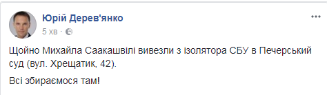 "Только что (около 08.45 - Прим.Ред.) Михаила Саакашвили вывезли из изолятора СБУ в Печерский суд, ул. Хрещатик, 42. Все собираемся там", - написал Деревянко.