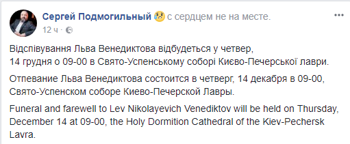 Отпевание хормейстера и народного артиста Украины состоится в четверг, 14 декабря в 09:00 в Свято-Успенском соборе Киево-Печерской Лавры.