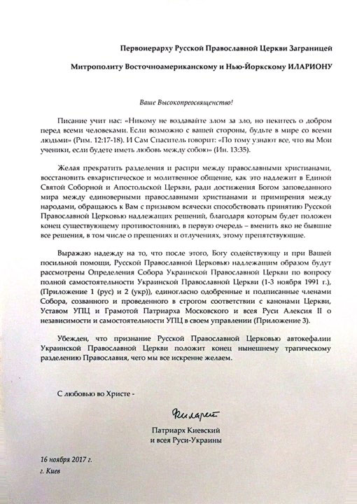 "Убежден, что признание Русской Православной Церковью автокефалии Украинской Православной Церкви положит конец нынешнему трагическому разделению Православия, чего мы все искренне желаем", – написал Филарет.