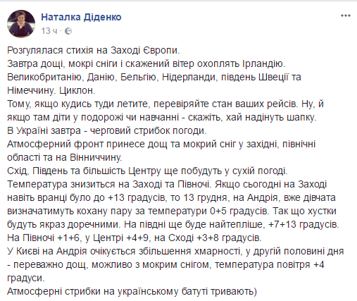 "Если сегодня на Западе даже утром было до +13 градусов, то 13 декабря, на Андрея, уже девушки будут определять любимую пару при температуре 0 +5 градусов. Так что платки будут как раз кстати. На юге еще будет теплее, +7 +13 градусов. На Севере +1 +6, в Центре +4 +9, на Востоке +3 +8 градусов" - написала Диденко.