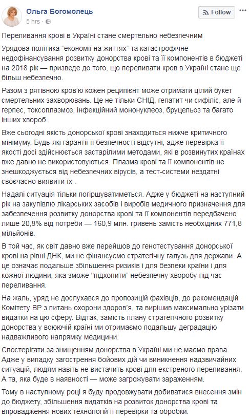 По ее словам, недофинансирование развития донорства крови и ее компонентов в бюджете на 2018 год приведет к тому, что переливать кровь в Украине станет еще более опасно.