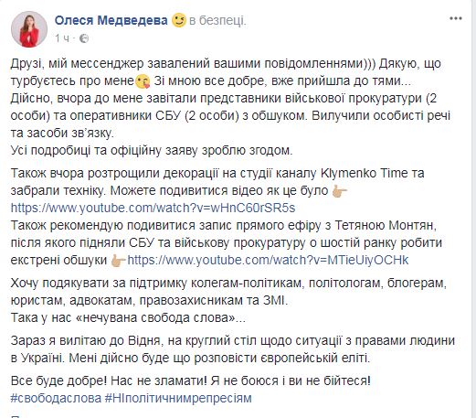 "Действительно, вчера ко мне пришли представители военной прокуратуры (2 человека) и оперативники СБУ (2 человека). Изъяли личные вещи и средства связи. Все подробности и официальное заявление сделаю впоследствии. Также вчера разбили декорации на студии канала Klymenko Time и забрали технику", - сообщила она.