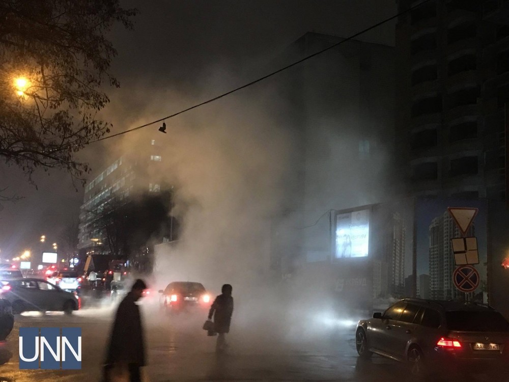 В среду, 13 декабря в Киеве на пересечении улиц Евгения Коновальца и Михаила Заднепровского прорвало трубу с горячей водой. Люди пытаются пройти по дороге, перепрыгивая через разлившийся кипяток.