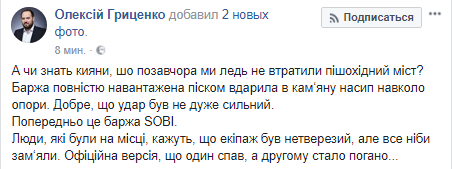 Один из лидеров Автомайдана и сын экс-министра обороны Алексей Гриценко заявил, что недавно в Киеве из-за действий экипажа баржи, едва не был поврежден пешеходный мост. Об этом он написал в Facebook.