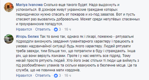 "Как и врачи, пожарно - спасательные подразделения выполняют задачи гуманитарного характера и работают в условиях чрезвычайной ситуации любого характера. Людей спасать надо всегда, тем более тех, что попали в беду и страдают. Другое дело, что они плетут языками. Однако и у нас мелют все подряд. Поэтому пусть просто спасают людей. Кто его знает столько люди еще вынут из под разбомбленных обломков и сколько эвакуируют в безопасное место. Это та служба, которая не должна иметь границ", - поддерживает другой коммеентатор.