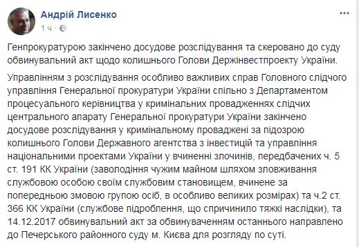 "Управление по расследованию особо важных дел Главного следственного управления Генеральной прокуратуры Украины совместно с департаментом процессуального руководства по уголовным производствам следователей центрального аппарата Генеральной прокуратуры Украины закончило досудебное расследование в уголовном производстве по подозрению бывшего главы Государственного агентства по инвестициям и управлению национальными проектами Украины в совершении преступлений", - написал он на странице в Фейсбуке в пятницу.