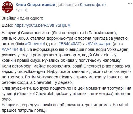 В ночь на субботу, 16 декабря, в Киеве на улице Саксаганского произошло дорожно-транспортное происшествие с участием автомобилей Chevrolet и Volkswagen. Об этом сообщает "Киев Оперативный" на своей странице в Facebook.