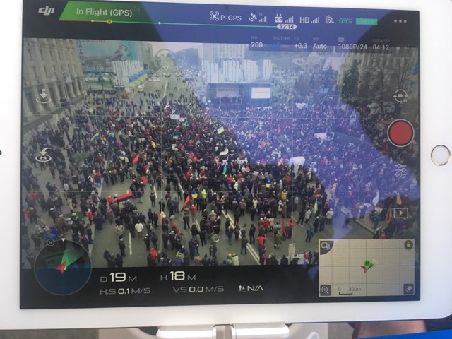 13:54 МихоМайдан в центре Киева сейчас. Вот так это выглядит с планшета, который управляет квадрокоптером.