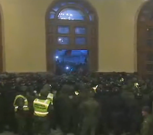 15:25 Выбили стекла в двери. Но изнутри полиция начала поливать майдановцев из порошковых огнетушителей. Поэтому внутрь активисты еще не пробрались.