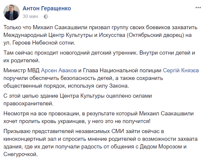15:46 Нардеп Антон Геращенко утверждает, что в зале дворца идут детские утренники. По его словам, глава МВД Арсен Аваков поручили "обеспечить порядок".