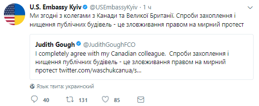 "Мы согласны с коллегами из Канады и Великобритании. Попытки захвата и уничтожения публичных зданий - это злоупотребление правом на мирный протест", - говорится в сообщении.
