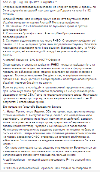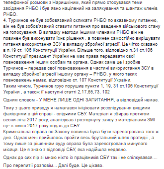 В частности, по его данным, во время крымских событий и.о. президента Турчинов не обязан был созывать 28 февраля 2014 г. заседание СНБОУ. Однако Турчинов передал свои полномочия в части использования ВСУ на случай вооруженной агрессии другому органу - СНБО, у которого таких полномочий нет согласно Конституции Украины.