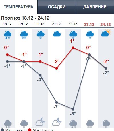 Сайт Gismeteо обещает осадки в виде мокрого снега всю неделю. Днем -1...-2. С четверга по субботу ресурс обещает морозный пик: -4...-6 днем. Ночью -2...-9. С 21 на 22 декабря до -12 в темное время суток.