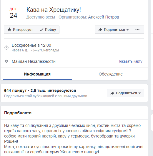 "На кофе и общение с друзьями ждем киевлян, гостей города и отдельно героев нашего времени, настоящих участников войны с восточным соседом! С собой иметь хорошее настроение, кофе в термосах, бутерброды и конфеты Рошен! Цель - показать обществу несколько иную картинку, чем еженедельные политические вакханалии и попытка штурма Октябрьского дворца!", - говорится в описании мероприятия в соцсети.