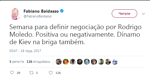 Бразильский журналист Фабиано Балдассо в своем Twitter написал, что "бело-голубые" всерьез присматриваются к бразильскому легионеру греческого Панатинаикоса Родриго Моледо.