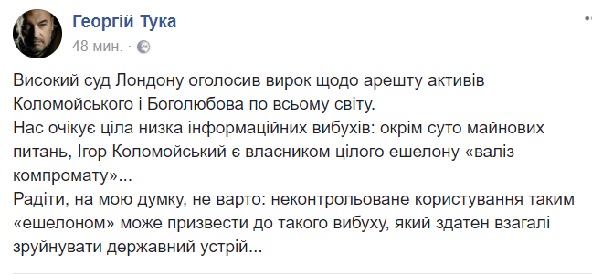 "Нас ожидает целый ряд информационных взрывов: кроме чисто имущественных вопросов, Игорь Коломойский является владельцем целого эшелона "чемоданов компромата", - считает замминистра.