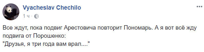 "Все ждут, пока подвиг Арестовича повторит Пономарь. А я вот всё жду подвига от Порошенко: "Друзья, я три года вам врал....", - написал Чечило.