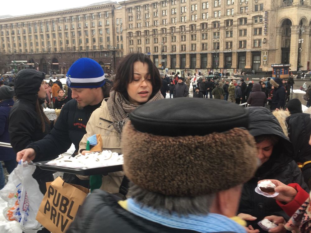 В полдень они встретились в центре столицы, чтобы выпить кофе и поесть конфет "Рошен" - последняя опция прямо была указана в анонсе события на Facebook.