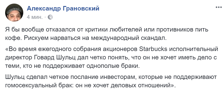 "Во время ежегодного собрания акционеров Starbucks исполнительный директор Говард Шульц дал четко понять, что он не хочет иметь дело с теми, кто не поддерживает однополые браки.