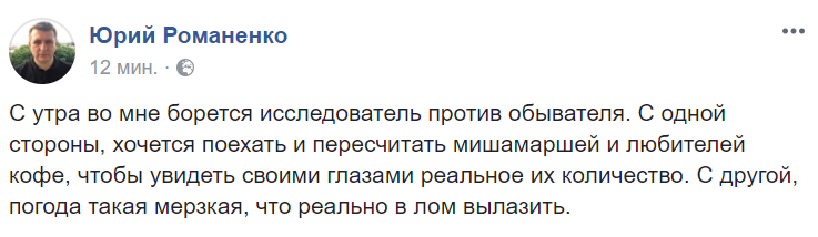 11:46 В соцсетях начинают потихоньку комментировать акцию, которая еще не началась. Журналист Юрий Романенко пишет, что в нем борются исследователь с обывателем - хочет посчитать сторонников "кофемайдана", но мешает погода.