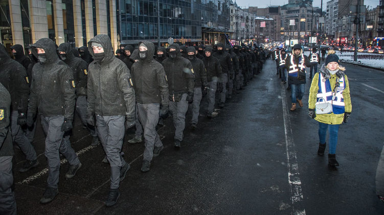 Нацкорпус опубликовал видео марша "Национальных дружин" по центру Киева. 600 человек прошлись от Аллеи Небесной сотни по Крещатику и закончили путь в крепости Косой капонир (Киевской крепости).