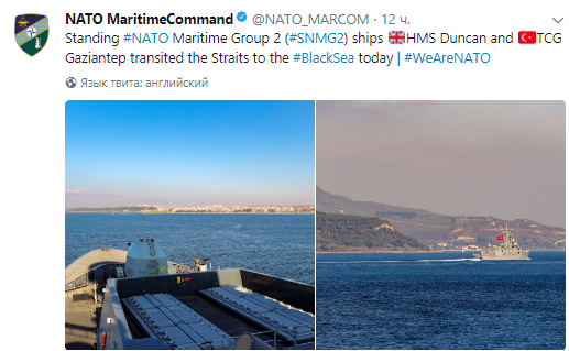 "Входящие в состав постоянной военно-морской группы НАТО №2 (SNMG2) британский эсминец Duncan и турецкий фрегат "Газиантеп"… вошли в Черное море сегодня", - говорится в в сообщении.