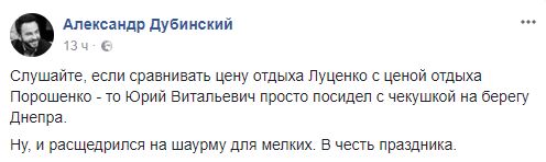 Журналист Александр Дубинский указывает на то, что расходы генпрокурора на отдых несравнимы с расходами президента: "Слушайте, если сравнивать цену отдыха Луценко с ценой отдыха Порошенко - то Юрий Витальевич просто посидел с чекушкой на берегу Днепра. Ну, и расщедрился на шаурму для мелких. В честь праздника".