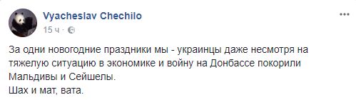 Журналист Вячеслав Чечило шутит: "За одни новогодние праздники мы - украинцы даже несмотря на тяжелую ситуацию в экономике и войну на Донбассе покорили Мальдивы и Сейшелы. Шах и мат, вата".