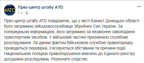 В Бахмуте Донецкой области задержали военного ВСУ, который похитил транспортное средство. Об этом сообщает штаб АТО в Facebook.
