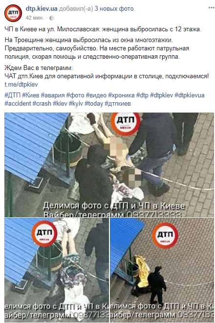 В Киеве на улице Милославской, что на Троещине произошла трагедия: женщина выбросилась из окна 12 этажа жилого дома. Об этом сообщают очевидцы на странице dtp.kiev.ua в Facebook.