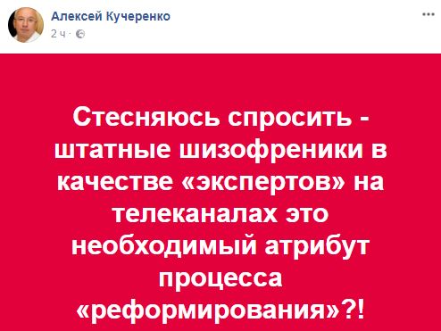 Политик Алексей Кучеренко задается вопросом: "Стесняюсь спросить - штатные шизофреники в качестве "экспертов" на телеканалах это необходимый атрибут процесса реформирования?!"
