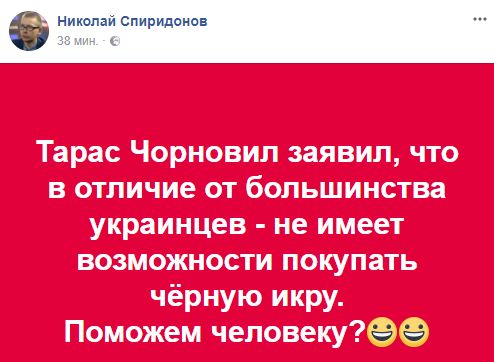 Политический консультант Николай Спиридонов шутит: "Тарас Чорновил заявил, что в отличие от большинства украинцев - не имеет возможности покупать черную икру. Поможем человеку?"
