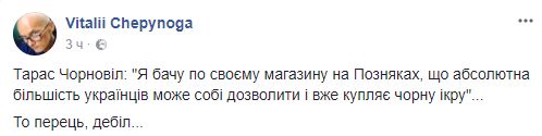 Депутат Виталий Чепинога смеется над политиком: " Тарас Чорновил: "Я вижу по своему магазина на Позняках, что абсолютное большинство украинцев может себе позволить и уже покупает черную икру" ... Это перец!"