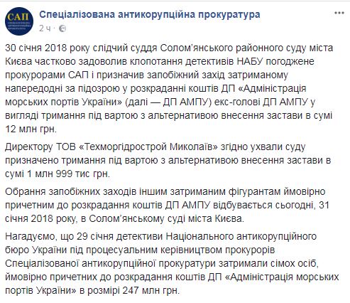 29 января детективы Национального антикоррупционного бюро задержали семерых человек, вероятно причастных к хищению средств АМПУ в размере 247 млн. грн.
