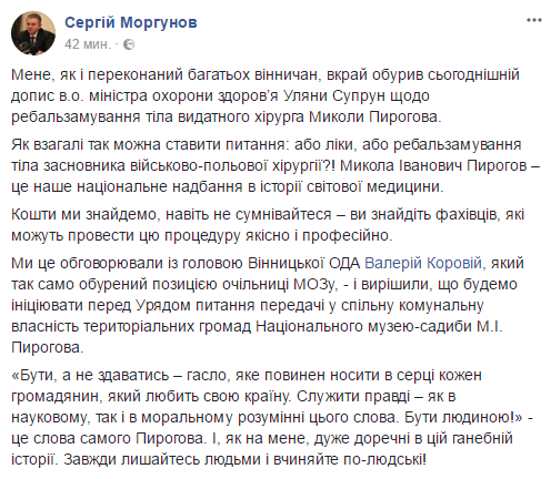 "Меня, как и убежден многих винничан, крайне возмутил сегодняшний сообщение и.о. министра здравоохранения Ульяны Супрун по ребальзамирование тела выдающегося хирурга Николая Пирогова. Как вообще так можно ставить вопрос: или лекарства, или ребальзамирование тела основателя военно-полевой хирургии?! Николай Иванович Пирогов - это наше национальное достояние в истории мировой медицины. Средства мы найдем, даже не сомневайтесь - вы найдите специалистов, которые могут провести эту процедуру качественно и профессионально. Мы это обсуждали с главой Винницкой ОГА Валерий Коровий, который так же возмущен позицией руководительницы Минздрава, - и решили, что будем инициировать перед Правительством вопрос передачи в общую коммунальную собственность территориальных общин Национального музея-усадьбы Н.И. Пирогова. "Быть, а не казаться - лозунг, который должен носить в сердце каждый гражданин, который любит свою страну. Служить правде - как в научном, так и в моральном смысле этого слова. Быть человеком" - это слова самого Пирогова. И, по-моему, очень уместны в этой позорной истории. Всегда оставайтесь людьми и делайте по-человечески!", - написал Моргунов.