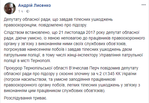 Следствие установило, что депутат облсовета, "действуя умышленно, с явным неуважением к работникам правоохранительных органов... нанес телесные повреждения двум патрульным полиции, в том числе женщине-инспектору".