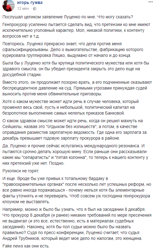 Главный редактор "Страны" Игорь Гужва, который был вынужден просить политическое убежище в Австрии, на своей странице в Facebook прокомментировал заявление генпрокурора Юрия Луценко в свой адрес.