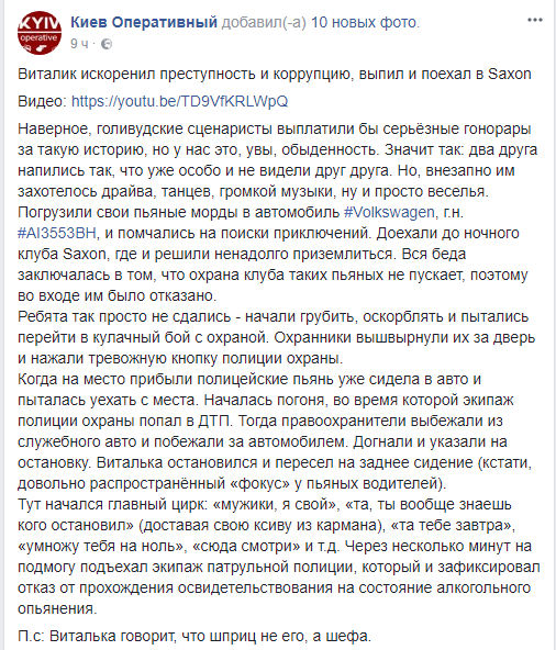 "Виталька остановился и пересел на заднее сидение (кстати, довольно распространённый "фокус" у пьяных водителей). Тут начался главный цирк: "мужики, я свой", "та, ты вообще знаешь кого остановил" (доставая свою ксиву из кармана), "та тебе завтра", "умножу тебя на ноль", "сюда смотри" и т.д. Через несколько минут на подмогу подъехал экипаж патрульной полиции, который и зафиксировал отказ от прохождения освидетельствования на состояние алкогольного опьянения", - сообщает ресурс.