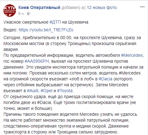 Предварительно, около полуночи с 3 на 4 февраля водитель Mercedes выехал на проспект Шухевича против движения. Присутствующие на месте патрульные полицейские начали погоню за авто. Через несколько сотен метров Mercedes въехал в  автомобиль Dacia, - последний отбросило на встречную полосу.