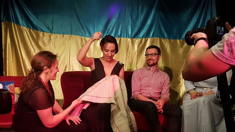 Певица вышила несколько узоров на подаренном ей рушнике, после чего сфотографировалась с поклонниками. Фаны украинской певицы вручили ей еще один презент - книгу "Один год в Стокгольме".