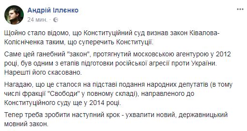 "Именно этот позорный "закон" был одним из этапов подготовки российской агрессии против Украины. Наконец он был отменен. Напомню, что это произошло на основании представления народных депутатов (в том числе фракции "Свободы" в полном составе), направленного в Конституционный суд еще в 2014 году", - написал Ильенко.