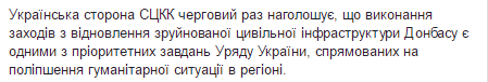Об этом сообщила украинская сторона Совместного центра по контролю и координации вопросов прекращения огня и стабилизации линии разграничения сторон на Донбассе (СЦКК), передает пресс-центр штаба АТО.