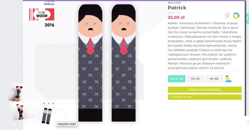 Магазин выставил на продажу носки в виде Адольфа Гитлера, после чего государственный музей Аушвиц-Биркенау обвинил его в использовании "крупнейшего преступника в истории человечества в целях маркетинга".