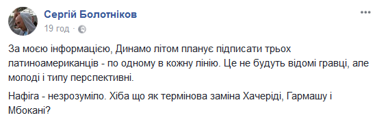 Но зачем - непонятно. Разве что как срочная замена Хачериди, Гармашу и Мбокани?", - написал Сергей Болотников.