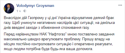 Премьер-министр Владимир Гройсман поручил руководству НАК "Нафтогаз Украины" в сжатые сроки урегулировать вопрос нехватки газа, которая возникла в результате действий "Газпрома".