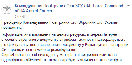 Указывается, что 7 февраля, в ходе проведения общей проверки наличия секретных документов, дел и других материальных носителей секретной информации за 2017 в режимно-секретном отделе управления защиты информации Воздушных сил ВСУ обнаружено отсутствие материального носителя секретной информации.