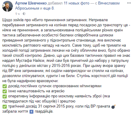 "По поводу криков о якобы унижении задержанных. Непродолжительное пребывание задержанного на коленях перед посадкой в транспорт это - никакое не унижение, а общеупотребительное полицейскими разных стран тактика обеспечения личной безопасности сотрудника путем приведения задержанного в подконтрольное положение, исключающее возможность внезапного нападения на него. Именно поэтому, чтобы не держать на холодной погоде задержанных лежа на снегу лицом вниз, был избран такой способ контроля. Удивительно, что этих базовых тактических правил не знает нардеп Мустафа Найем, который сам был причастен к набору в патрульную полицию в нескольких городах в 2015-2016 годах. При этом вчера утром под ВР уже задержанным, которые сидели на корточках или стояли на коленях, позволяли общаться, курить и не били", - написал Шевченко в Facebook.