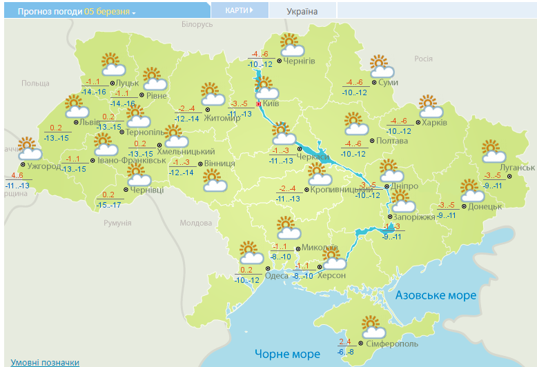 В понедельник, 5 марта, территорию Украины покинет циклон, который принес снегопады на прошлой неделе. Во всех регионах обещают переменную облачность без осадков. При этом на юге и западе днем потеплеет до 0...+2.