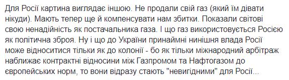"Газпром коварно, без предупреждения, в период аномальных холодов, не выполнил контрактные обязательства и не стал поставлять газ. Хотя до этого сам выставил за счет за март который Нафтогаз полностью оплатил. Нафтогаз течение фактически одних суток полностью заместил объемы газа от Газпрома на газ от европейских поставщиков", - пишет Витренко.