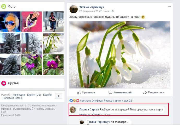 В письме, которое поступило в областную прокуратуру от ОО "УАА", контактным лицом указана Татьяна Чернишук. На странице человека с таким же именем и фамилией в Facebook пресс-секретарь генпрокурора Юрия Луценко Лариса Сарган достаточно дружно комментирует картинки о весне.